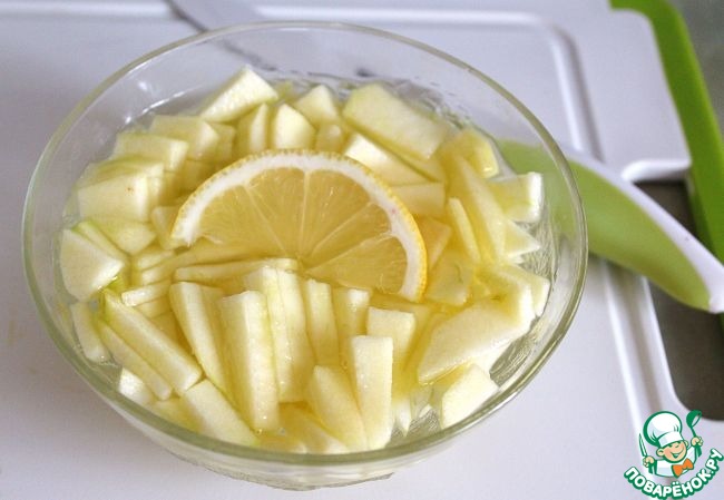Яблоко очистите, нарежьте ломтиками и положите на одну минуту в воду с долькой лимона, чтобы ломтики не потемнели.