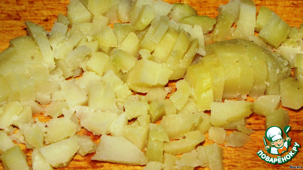 Картофель отариваем в мундире, остужаем, чистим и режем точно так же