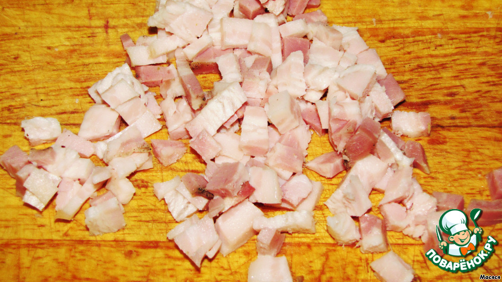 Бекон режем кубиком или тонкими полосками. Можно взять грудинку.