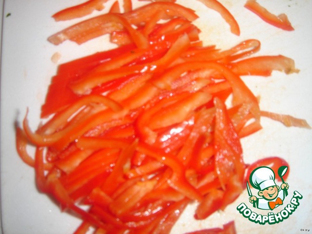 Перец порезать тонкой соломкой. При желании заменить его сушеным измельченным острым перцем.