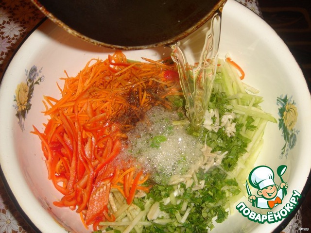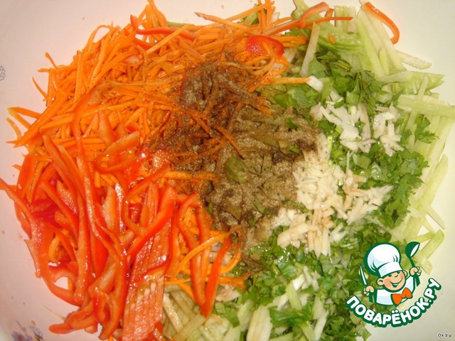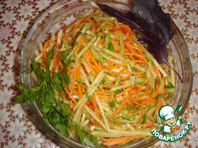 | Слегка островатый салат из редьки для ценителей корейской кухни. |