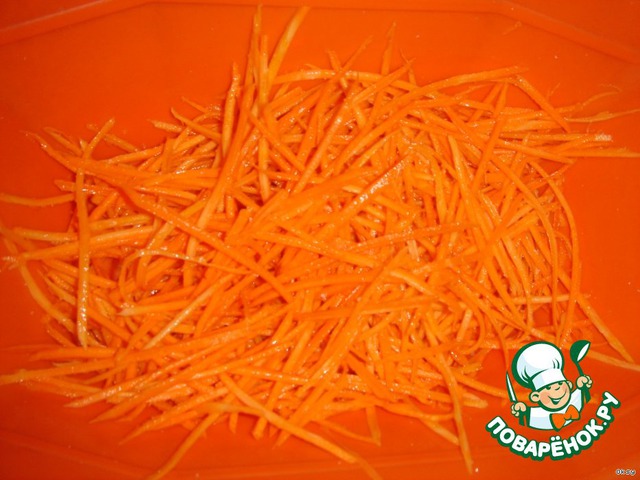 Морковь нашинковать на терке для корейских салатов (потоньше), посолить, добавить сахар и хорошо перетереть морковь.