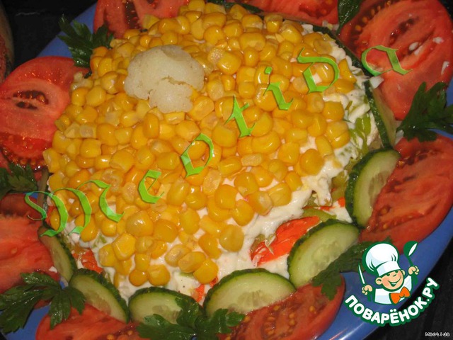 Сверху выкладываем кукурузку, по бокам - дольки огурчика и кусочки помидорчика в виде лепестков, немножко петрушки и..