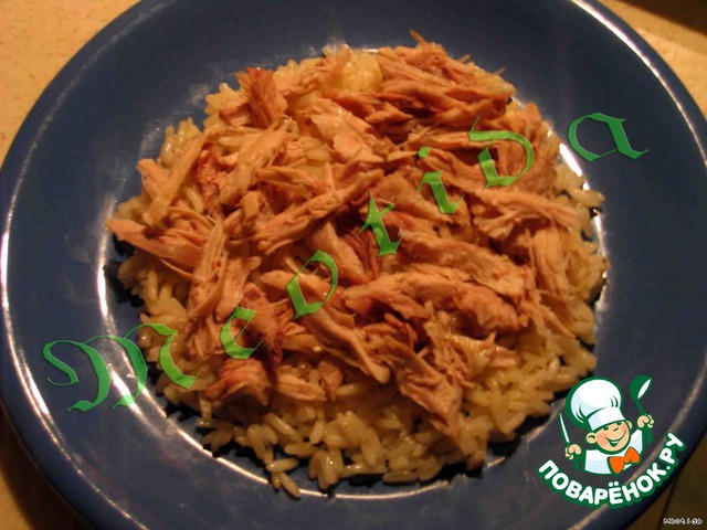 На тарелку выкладываем слой риса, слой вареного белка (тертого на крупной терке) и слой курочки (я просто порвала руками на маленькие кусочки).