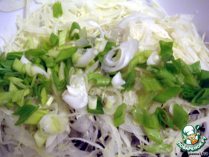 Белокочанную капусту тонко нашинковать (я это сделала овощечисткой), посолить и перемешать, если же Вы нарезали ножом, то можно немного посолить и помять руками. Добавить к морской капусте.
