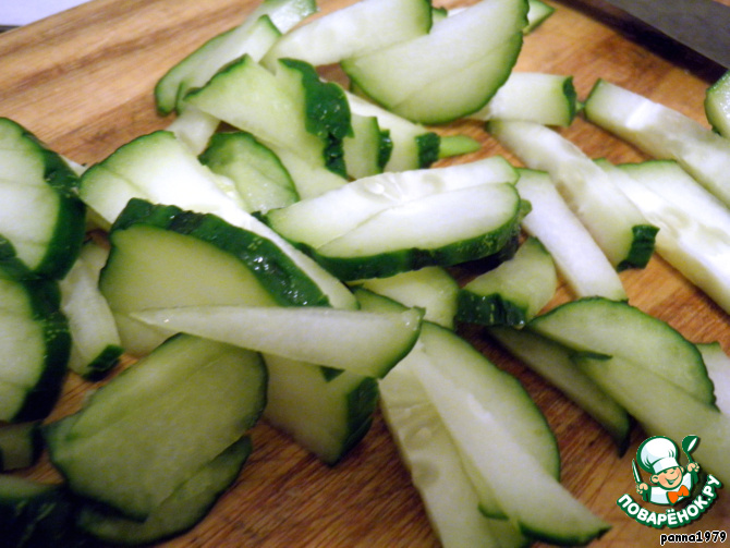 Свежий огурец мелко нарезать, лучше соломкой. Если есть терка бернера, то можно натереть на ней. Но я обошлась и без нее, просто тоненько нарезала на брусочки.