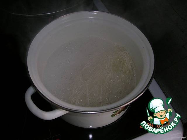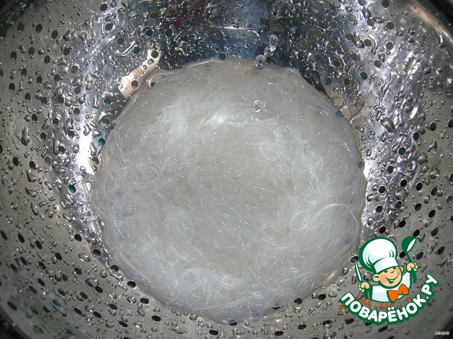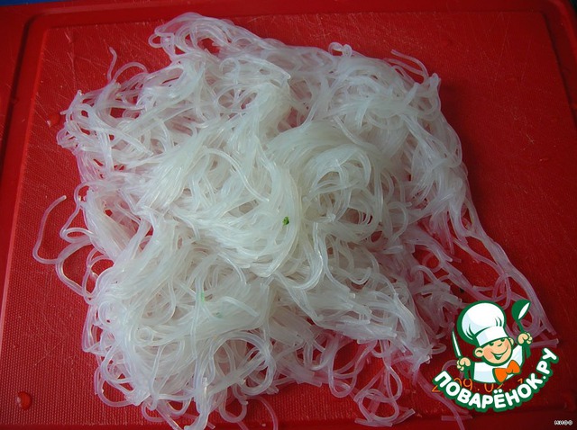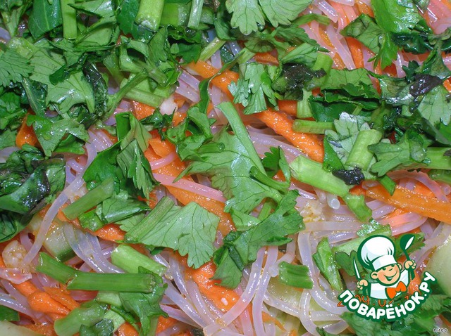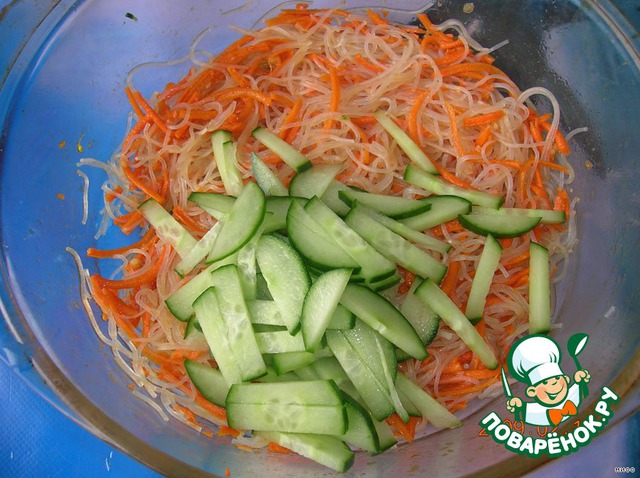 Отвариваем рисовую лапшу в кипящей подсоленной воде в течении 1 минуты, откидываем на дуршлаг, промываем кипячeной холодной водой, нарезаем на полоски около 3 см. Натираем морковь, солим, добавляем уксус, даeм постоять 30 минут. Далее выдавливаем в морковь чеснок, добавляем соевый соус, приправу, раскаляем на сковороде растительное масло, заливаем им морковь. Перемешиваем морковь и лапшу, нарезаем тонкими полосочками свежий огурец, мелко нарезаем кинзу, всe перемешиваем. Даeм постоять около 3 часов для пропитки. Очень вкусно!