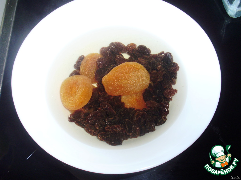 Изюм и курагу залить кипятком, оставить на 10-20 минут.