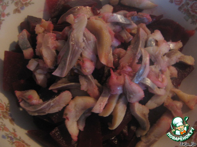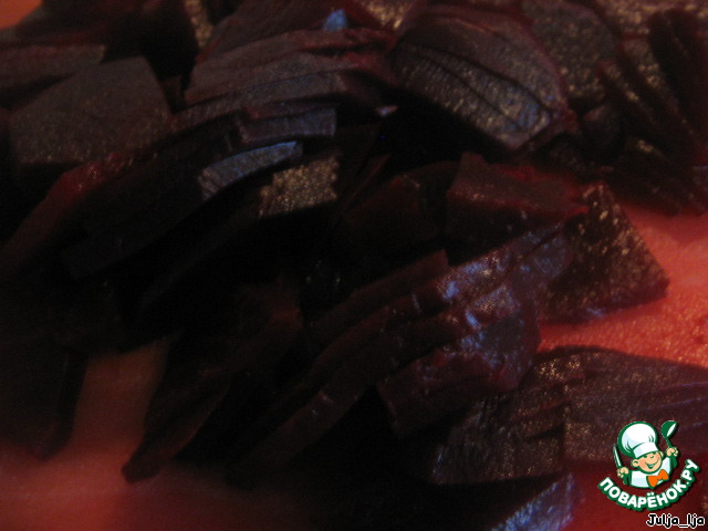 Свеклу нарезаем крупными ломтиками. Я разрезала каждую на 4 части, и потом ломтиками.