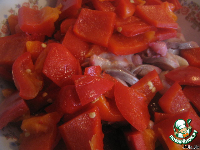 Перец очищаем от кожицы, нарезаем ломтиками.