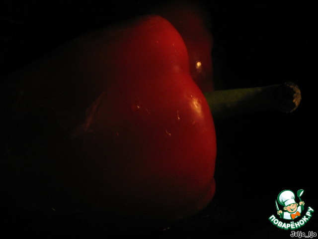 Болгарский перец немного смазываем оливковым маслом, запекаем в духовке или микроволновке (под грилем). Запекаем до того момента, пока кожица не сморщится.