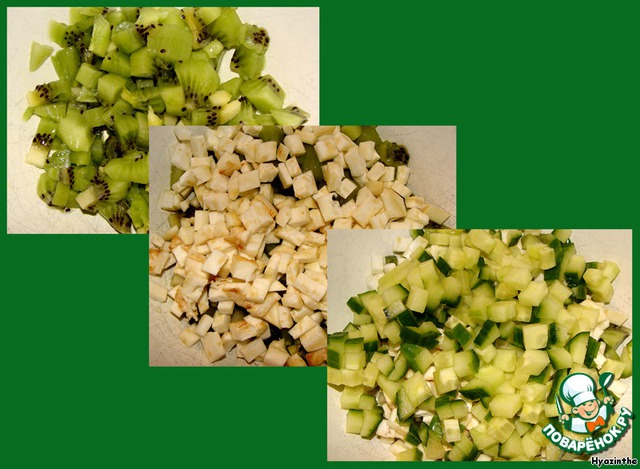 Корень сельдерея чистим, моем, нарезаем мелкими кубиками, добавляем к киви.