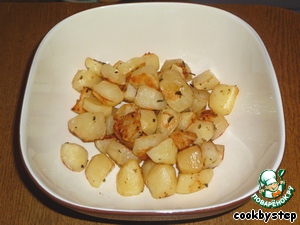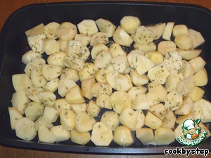 Картофель очистить (если он молодой, то можно просто тщательно промыть; у меня картофель молодой, но я все равно его очистил, т.к. не очень люблю с кожурой). Порезать на небольшие кусочки (у меня картофель совсем мелкий, поэтому резал на половинки или три части). Смазать противень оливковым маслом, выложить картофель, снова сбрызнуть оливковым маслом, немного посолить, орегано по вкусу. Запекать в духовке до готовности (у меня при температуре 180 градусов картофель приготовился за 20 минут).