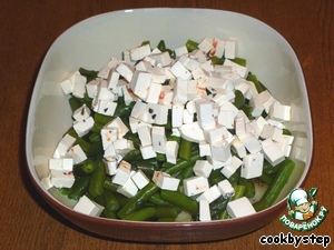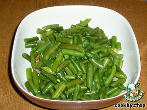 Стручковую фасоль отварить в кипящей подсоленной воде до готовности (у меня фасоль замороженная, и на варку ушло около 7 минут). Фасоль откинуть на дуршлаг, чтобы стекла лишняя жидкость и фасоль немного остыла. Остывшую стручковую фасоль добавить к картофелю.