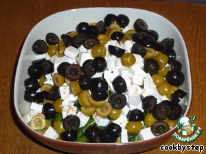 С черных и зеленых оливок слить лишнюю жидкость. Порезать на половинки, колечками или вообще оставить целыми на ваше усмотрение (у меня половинки). Отправить смесь оливок и маслин в салат.