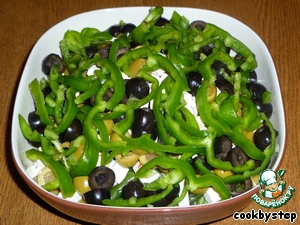 Сладкий перец очистить и порезать полосками. Добавить к салату.