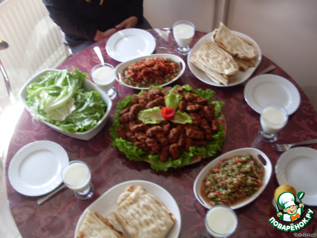 Вот, как мы собрались с турчанками. На столе коронное блюдо - Чии кёфе, в переводе - сырые котлеты. О нем я еще напишу, ждите!! И наш ложка-салат!!!