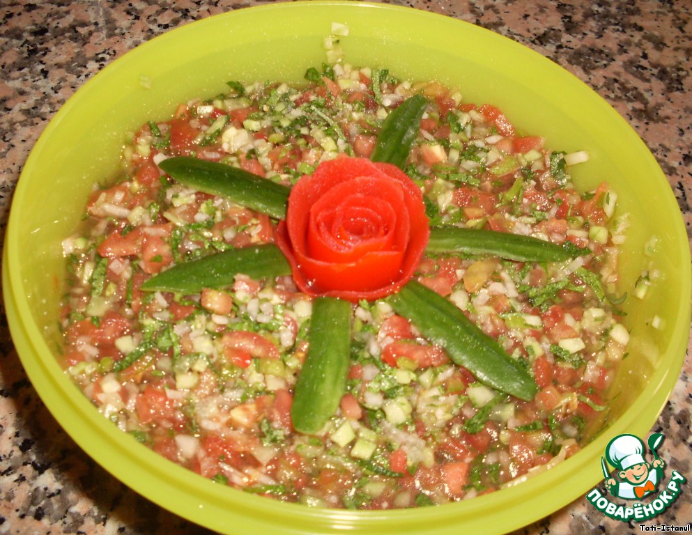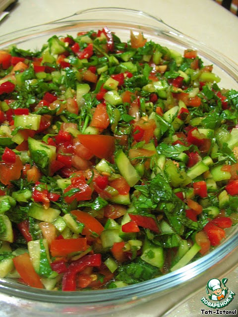 | Традиционный турецкий салат. Оригинальное название Кашык салатасы. Оригинальность салата в том, что надо нарезать все очень мелко; конечно, это отнимет много времени, но турчанкам делать нечего, сидят дома и соревнуются, кто мельче нарежет)))) У меня чуть грубовато получилось))) |