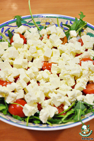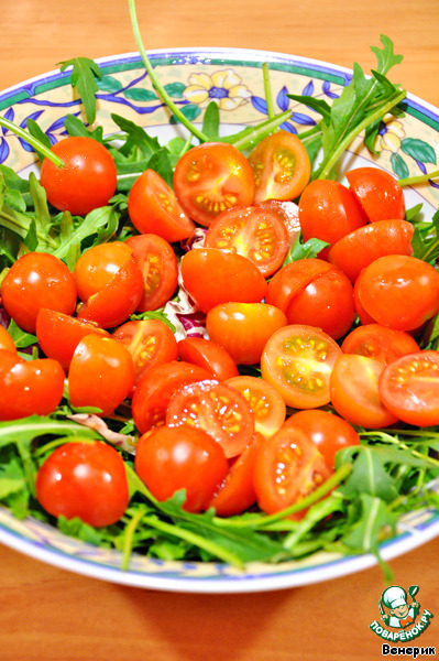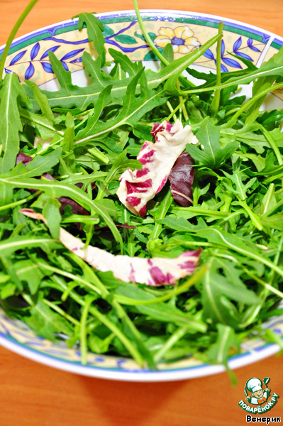 Крупно нарезать рукколу (у меня была мелкими листочками) и выложить в блюдо первым слоем.