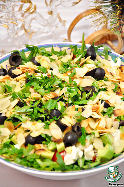 Миндальные хлопья или обжаренные кедровые орехи сверху - обязательно, они придают свою "изюминку" салату.