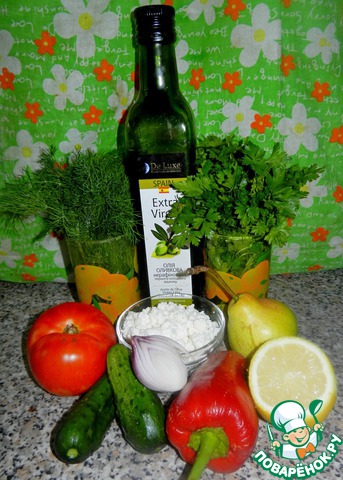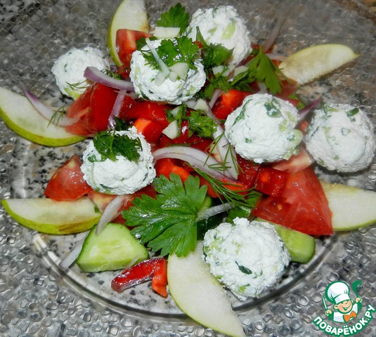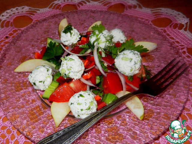 Овощной салат с творожно-огуречными шариками и грушей