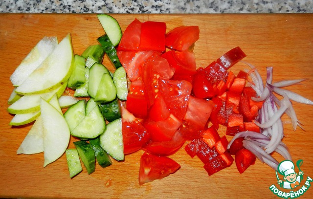 Остальные овощи и грушу нарезать. Я делала на 1/2 порции, поэтому овощи у меня ушли не все.