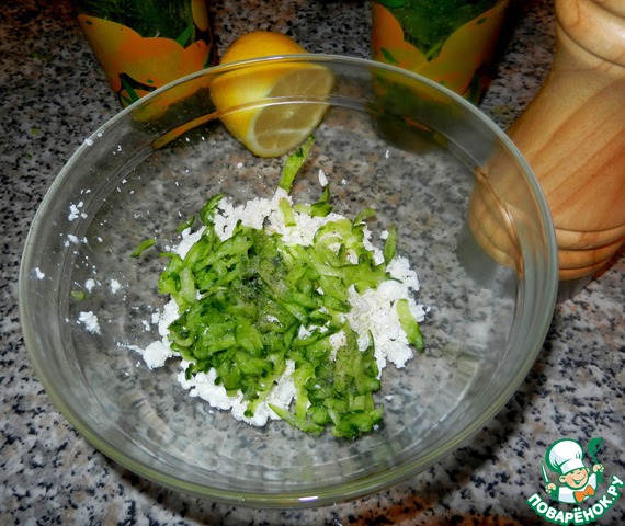 Огурец отжать в отдельую тарелку и добавить к творогу, влить 1/2 ч. л. лимонного сока, поперчить, посолить, если нужно (огурчик подсоленный) Смешать и сформировать шарики. Если творог сухой, то добавить немного сметаны.