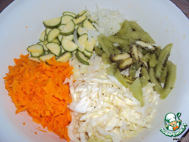 Морковь натереть на крупной тёрке, капусту нашинковать, лук мелко нарезать, кабачки нарезать полукольцами, киви нарезать соломкой.
