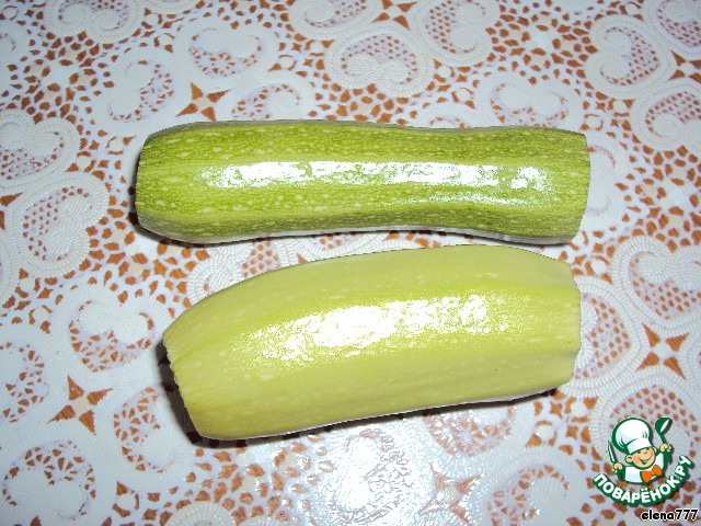 У меня были молодые кабачки, но можно взять крупные, "устаревшие", тогда их надо очистить от кожуры и семян и нарезать тонкими ломтиками.