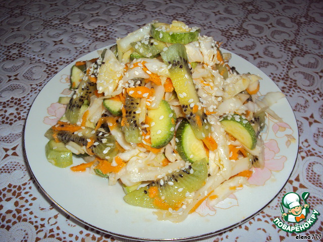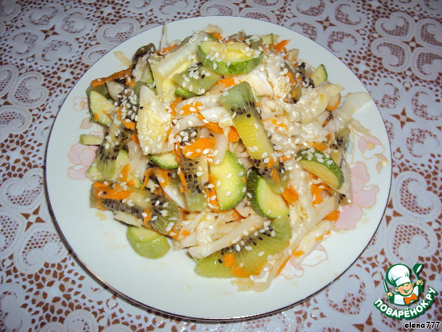 | Обязательно попробуйте этот овощной, очень вкусный, к тому же очень полезный салатик! А пикантная заправочка, кунжут и киви делают этот салат необычайно-изысканным! (Ещe, скажу вам по секрету, этот салат - очень полезное применение свежих кабачков) |