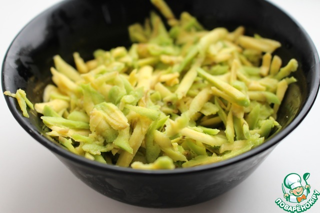 Натереть на крупной терке авокадо, сбрызнуть лимонным соком.