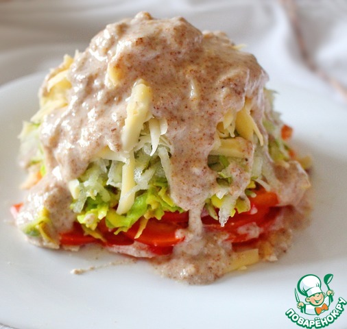 На тарелку выложить первым слоем болгарский перец, сбрызнуть растительным маслом и присыпать солью. Затем сверху выложить авокадо. Следующими слоями будут груша и сыр. Сверху полить орехово-чесночным соусом.