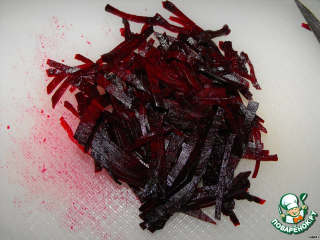 Отваренную свеклу нарезать соломкой.