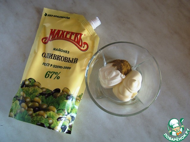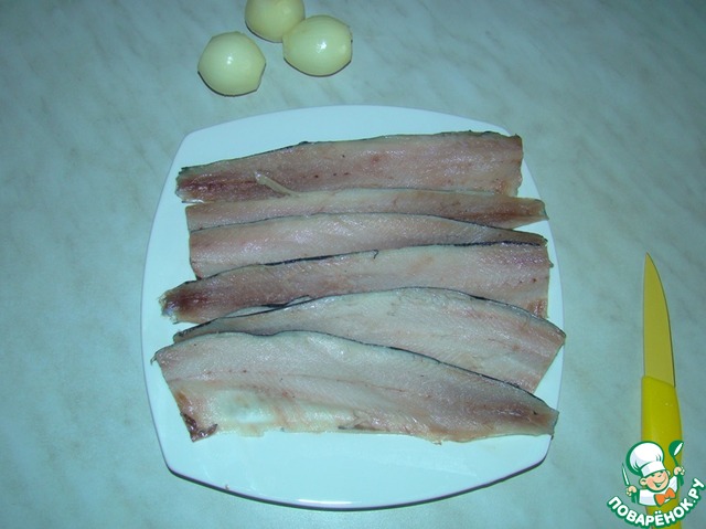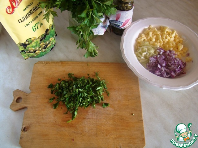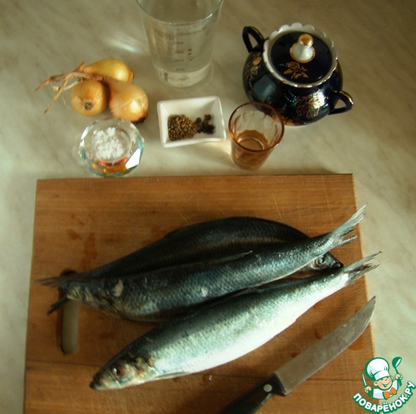 Для приготовления рольмопсов из свежемороженной сельди соберем необходимые приправы и рыбу.