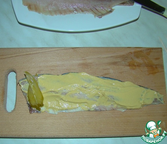 Обмажем горчицей филе и положим огурчик на широкий край филе.