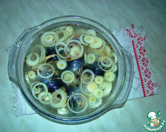 Приготовим маринад из воды, соли, сахара и приправ. Дадим прокипеть 3 минуты, выключим и добавим уксус. Охладим маринад до теплого состояния и заливаем им подготовленные рольмопсы с луком.