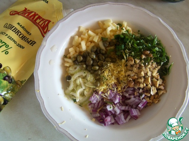 Соединить все в одном салатнике, добавить орехи, цедру и каперсы.
