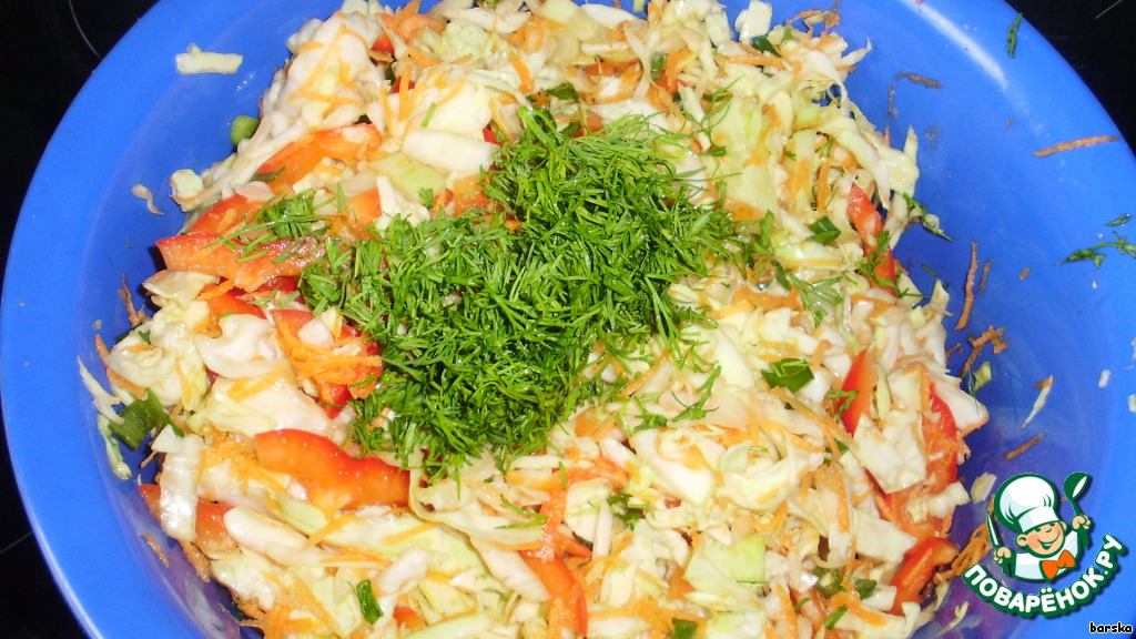 Смешать овощи с капустой и добавить мелко нарезанный укроп