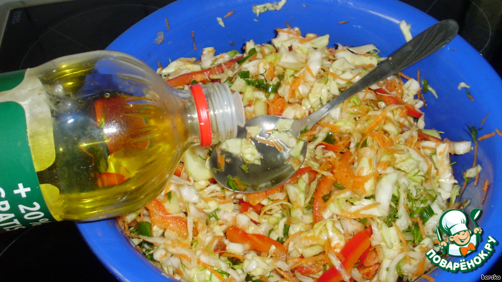 добавить растительное масло (у меня - Мацола, очень люблю его именно в салатах)