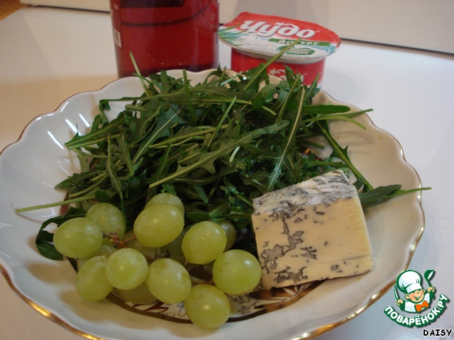 Прежде всего, вымоем и обсушим листья салата. Можно взять смесь разных салатов, в этот раз я взяла рукколу. Затем приготовим соус. Для чего разотрем в отдельной емкости голубой сыр, смешаем его с небольшим количеством йогурта (в исходном варианте – сливки), добавим немного винного уксуса [url=http://www.pova renok.ru/recipes/sho w/60640/]Уксус из красной смородины[/url]. Я всегда беру уксус, который делаю сама. Вот описание способа приготовления. Затем добавляю чуть-чуть меда, можно сахара. Тщательно перемешиваю, чтобы не было комочком. По густоте соус должен быть, как майонез.