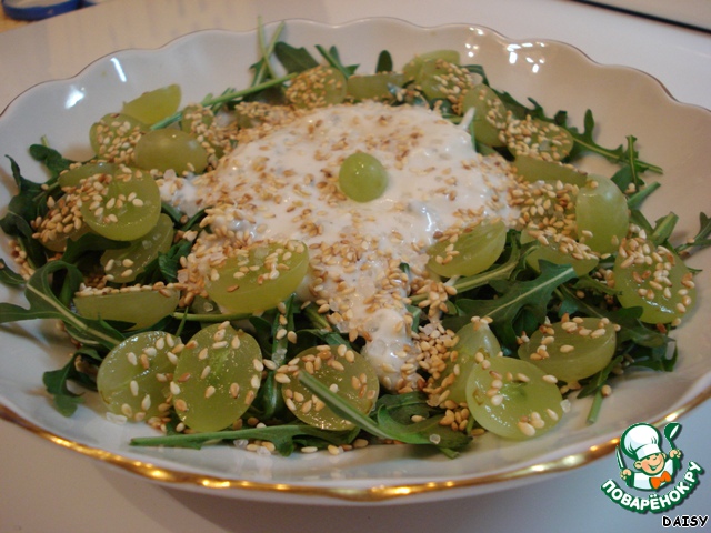 Перемешиваем салат с соусом, выкладываем виноград. Я солю крупной морской солью. Мне нравится, когда она на язык попадает. Затем посыпаем орешками (делала с грецкими или, предварительно обжаренными на сухой сковородке, кедровыми), я чаще всего посыпаю кунжутом, который подсушиваю.