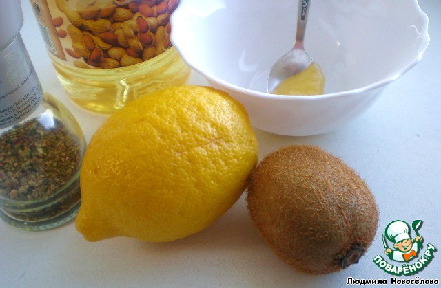 Смешаем масло, лимонный сок, вино, мёд и перец. Очистим киви и разомнем в пюре. Добавим в заправку, посыпаем перцем, перемешиваем.