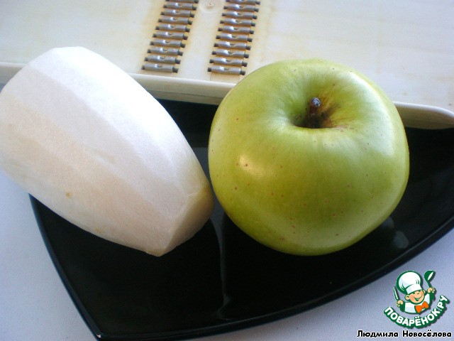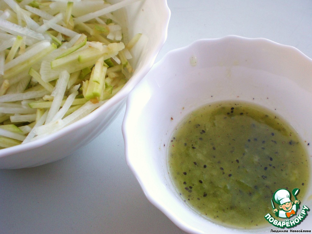 Натёрли на терке для "корейской моркови" дайкон и яблоки, или нарезали соломкой.