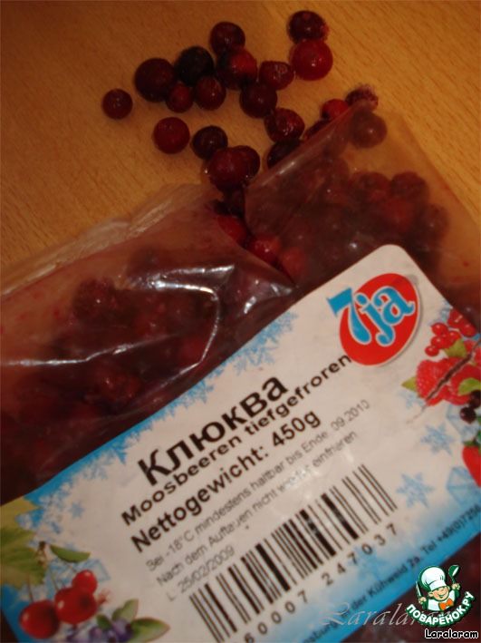 Вишню посыпаем сахаром и заливаем соком (заметьте, если у вас клюква не мороженая, а сухая, то её надо залить соком вместе с вишей).