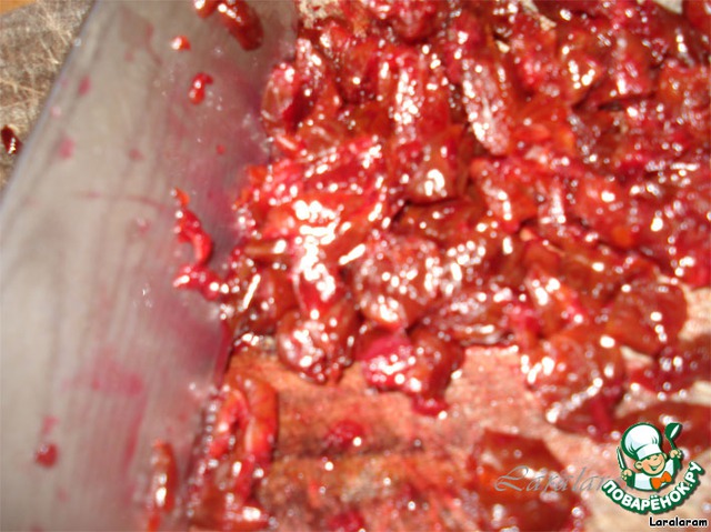 Вишенку достаём из сока и рубим ножом немного помельче…