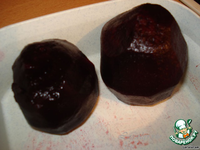 Перво-наперво свеклу моем хорошо, заворачиваем в фольгу и запекаем в духовке. Оно, конечно, можно и отварить, но это на самый худой случай (не идеальный вариант!), в крайнем случае отварить на пару можно... Готовить до состояния "почти-готовности", проверьте: спичка должна втыкаться с небольшим усилием. Даём остыть и чистим.