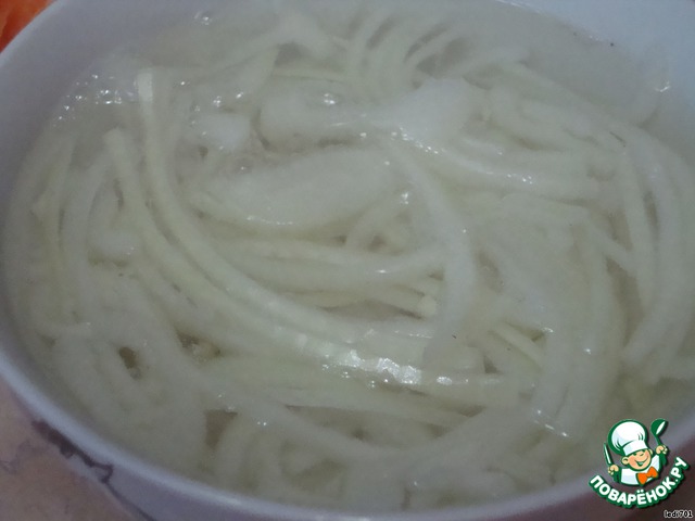 Лук нарезать полукольцами и залить горячей водой с уксусом. (у меня не было красного лука, я использовала белый.Думаю, что с красным луком салатик был бы веселей)