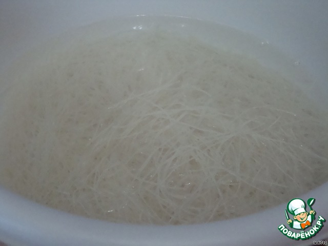 Рисовую лапшу залить кипятком на 2 мин. (дольше не надо держить, а то она развалится.)