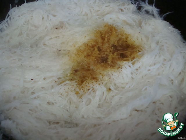 К чесноку добавляем рисовую лапшу, обжариваем до золотистого цвета. Я добавила для цвета немного куркумы.