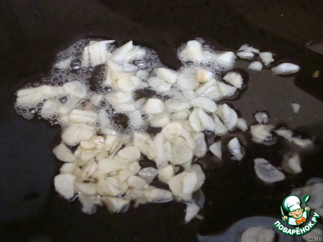 Чеснок мелко нарезаем и обжариваем на растительном масле 2 мин.